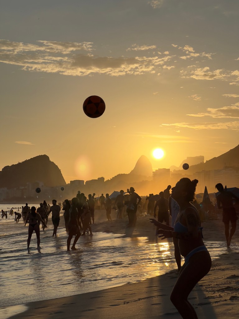 Vent de crème solaire, origan fumé des brochettes de fromage, « mattéééééé, maracujaaaa, limãoooo » hurlé par les vendeurs de plage. Les yeux en l’air pour le Christ, devant pour éviter les ballons qui virevoltent, écarquillés face aux Brésiliens qui brisent l’immensité des vagues. Les enceintes vibrent fort « tum tchak tum tum tum tchak » , les mêmes cris joyeux que ceux des cours d’école résonnent. Je crois que j’avais déjà imaginé cette journée avant de la vivre. Elle est tellement plus belle en vrai.