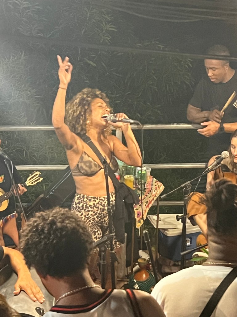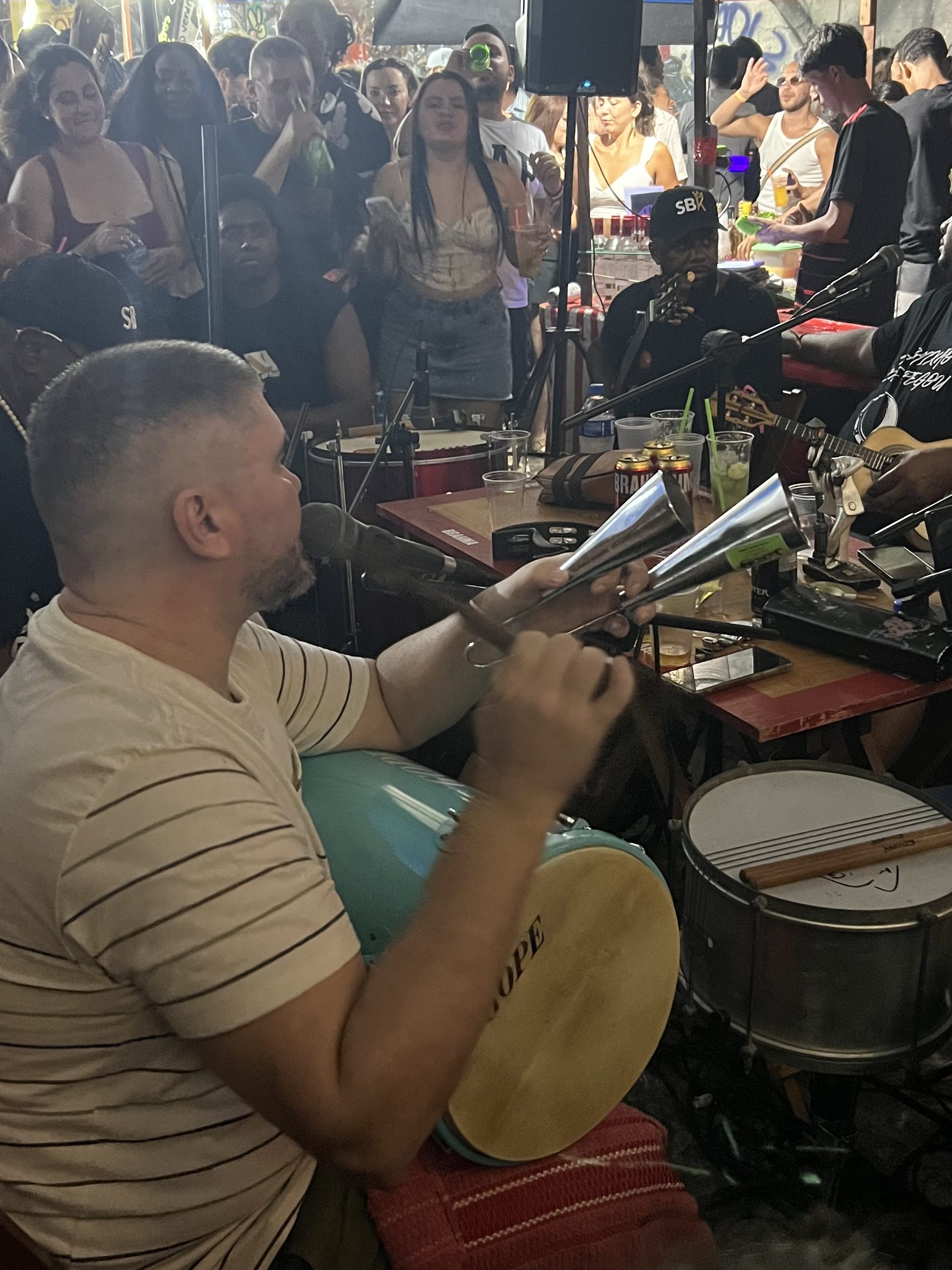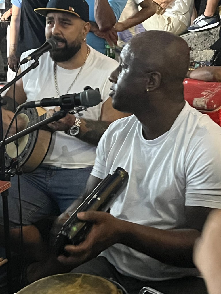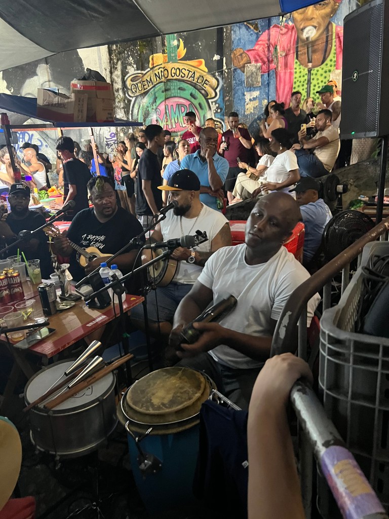 Un groupe d’une dizaine de musiciens (très souvent des hommes, même s’il existe des sambas féminins que je vous glisse à la fin), formant un cercle, entourés du public qui chante, danse et frappe des mains. C’est le rendez-vous hebdomadaire de beaucoup de Cariocas, on y va pour boire une bière avec des amis, écouter, chanter, danser, fêter un anniversaire…